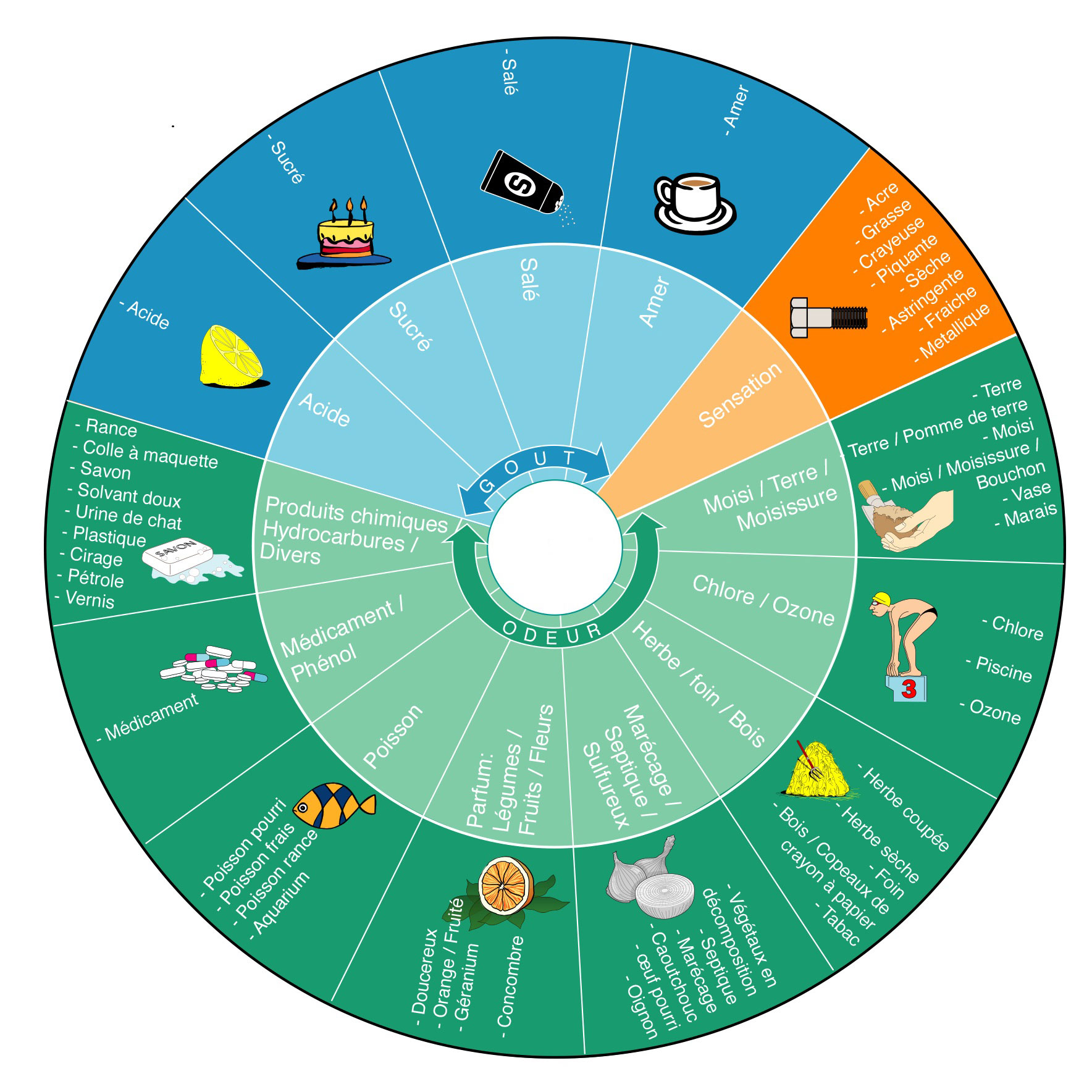 Sais-tu que les différents goûts de l’eau proviennent des éléments qui la composent, mais aussi de ta propre perception ? Le goût de l’eau « amer » que tu n’aimes pas est peut être celui que préfère ton copain de classe ! Il existe des dizaines de goûts qui sont répertoriés par catégories sur une roue, appelée la Ronde des Flaveurs. C’est grâce aux papilles de ta langue, mais aussi grâce à ton nez que tu arrives à détecter ces différentes saveurs… tout comme pour le vin !
